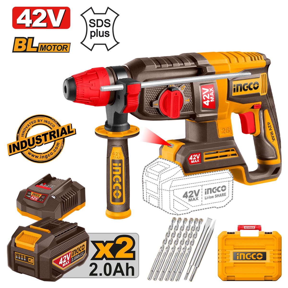 INGCO Πιστολέτο Περιστροφικό Κρουστικό Σκαπτικό Μπαταρίας 42V Li-Ion 2.5J 26mm