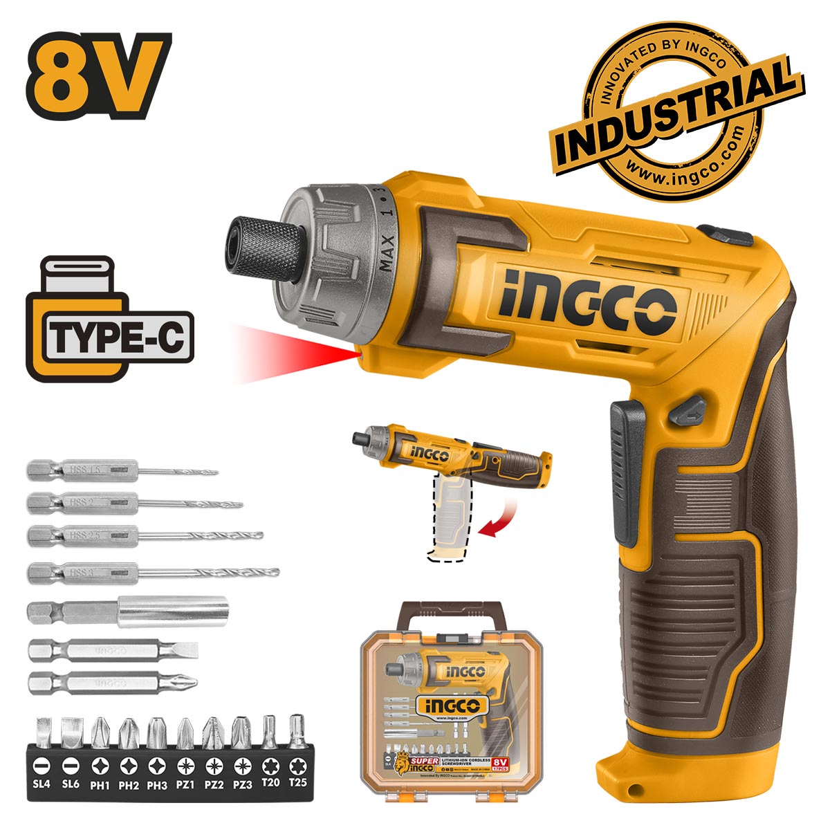 INGCO Κατσαβίδι Μπαταρίας 8V Li-Ion με Ενσωματωμένη Μπαταρία USB Type-C Σετ 17τεμ. 6Nm